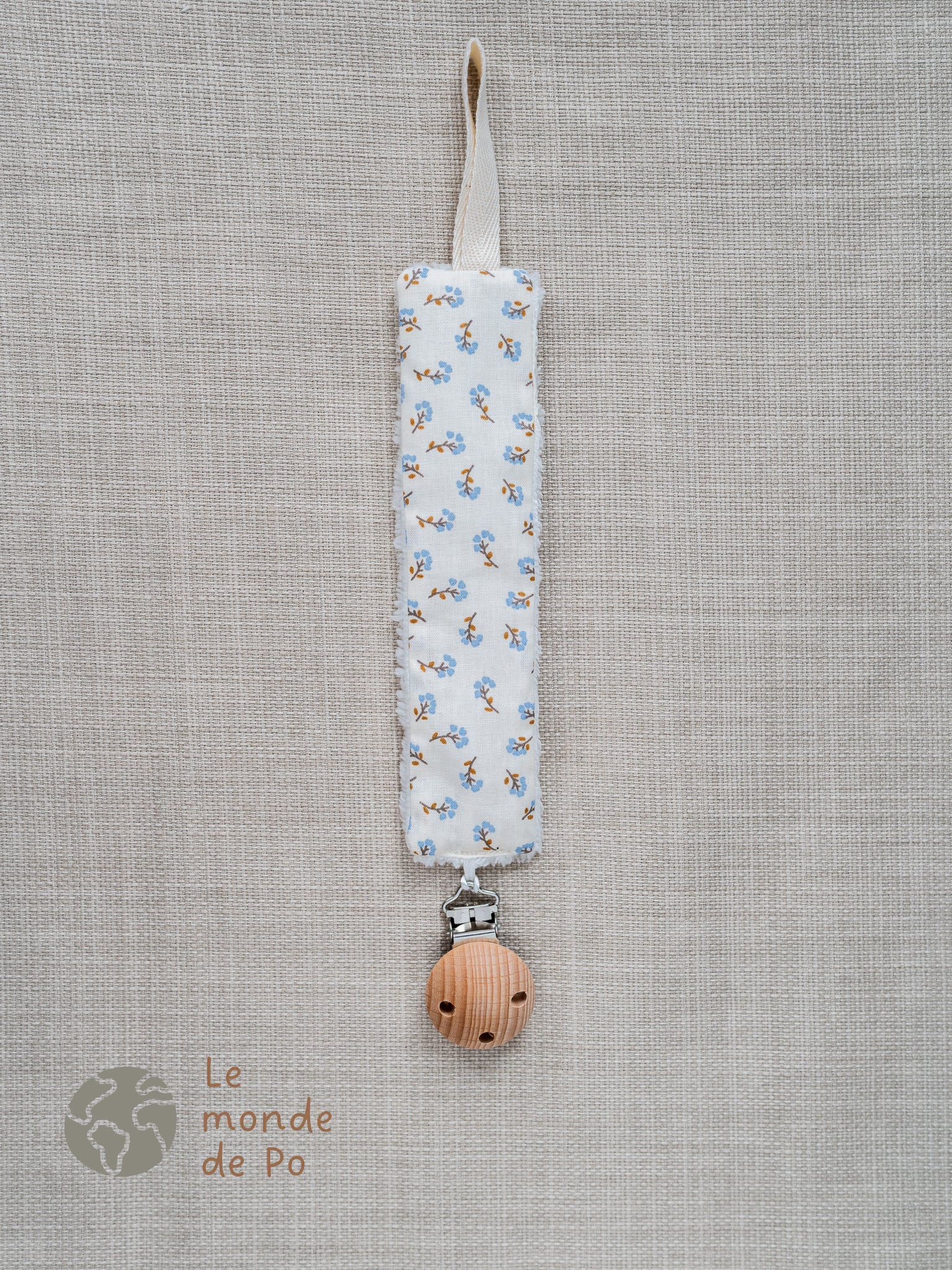 Avec cet attache tétine, la tétine de votre bébé sera toujours à (sa) portée de main. Fini les tétines qui tombent et qui se perdent. Cet attache tétine mesure 22 cm (sans compter le clip). Il est composé d'une face en coton avec motifs fleurs bleues et d'une autre en éponge bambou écru tout doux. Vous pourrez attacher la tétine de votre enfant sur cet accessoire grâce à un cordon plat présent à l'extrémité. Il vous suffira de faire un noeud autour de l'anneau de la tétine et le tour est joué. Vous pourrez attacher ce joli accessoire sur les vêtements, la couverture ou encore le doudou de bébé grâce au clip en bois.