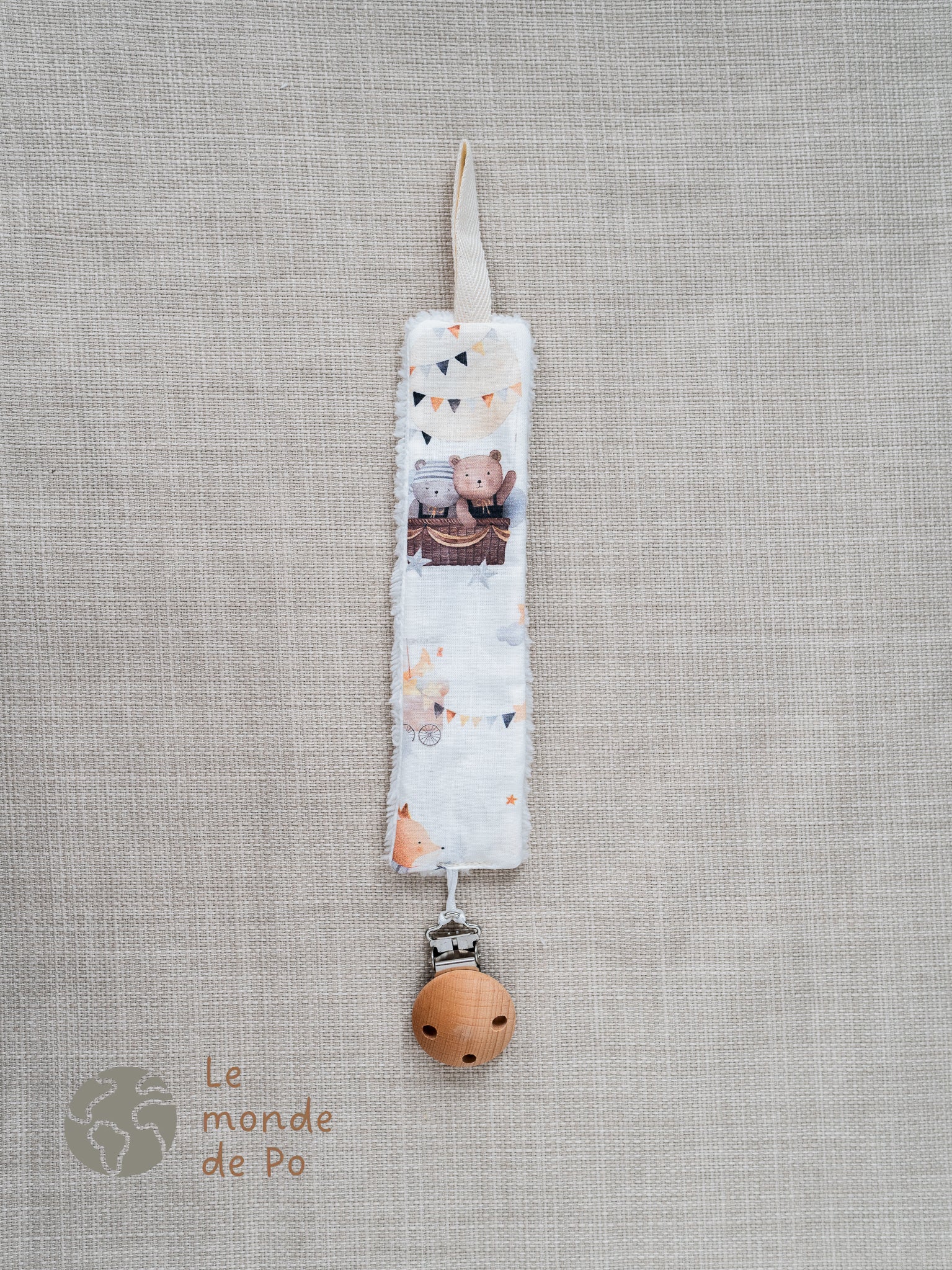 Avec cet attache tétine, la tétine de votre bébé sera toujours à (sa) portée de main. Fini les tétines qui tombent et qui se perdent. Cet attache tétine mesure 22 cm (sans compter le clip). Il est composé d'une face en coton écru avec animaux et d'une autre en éponge bambou écru tout doux. Vous pourrez attacher la tétine de votre enfant sur cet accessoire grâce à un cordon plat présent à l'extrémité. Il vous suffira de faire un noeud autour de l'anneau de la tétine et le tour est joué. Vous pourrez attacher ce joli accessoire sur les vêtements, la couverture ou encore le doudou de bébé grâce au clip en bois.