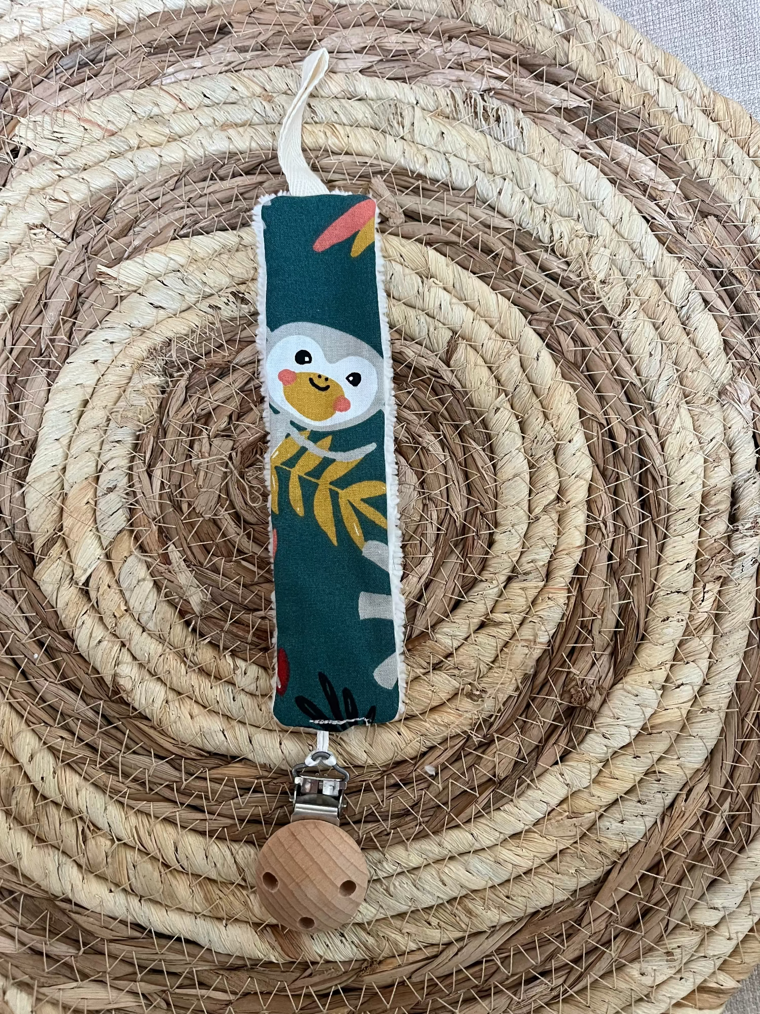 Avec cet attache tétine, la tétine de votre bébé sera toujours à (sa) portée de main. Fini les tétines qui tombent et qui se perdent. Cet attache tétine mesure 22 cm (sans compter le clip). Il est composé d'une face en coton vert avec motifs animaux de la jungle et d'une autre en éponge bambou écru tout doux. Vous pourrez attacher la tétine de votre enfant sur cet accessoire grâce à un cordon plat présent à l'extrémité. Il vous suffira de faire un noeud autour de l'anneau de la tétine et le tour est joué. Vous pourrez attacher ce joli accessoire sur les vêtements, la couverture ou encore le doudou de bébé grâce au clip en bois.