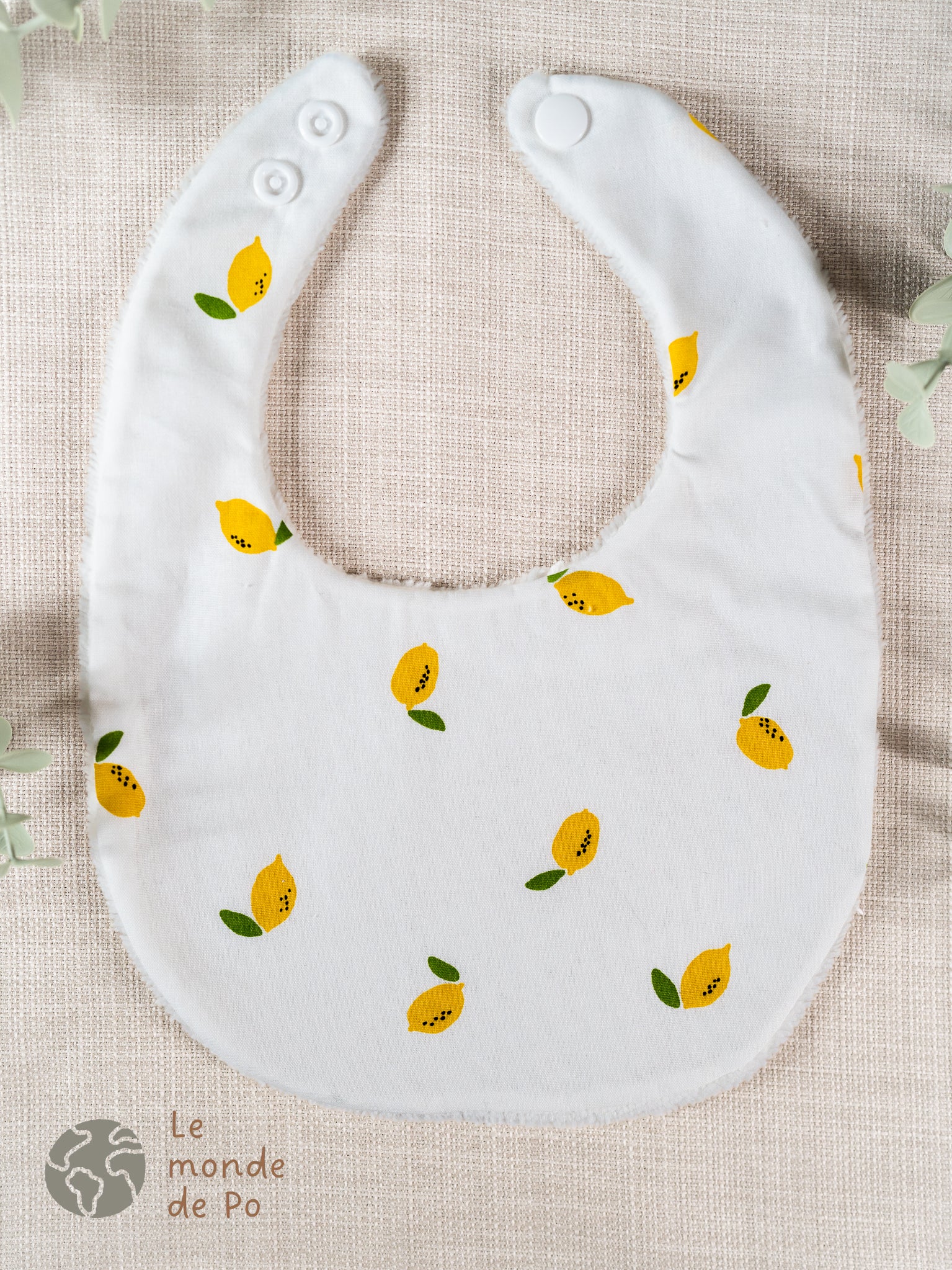 Ce bavoir convient dès la naissance jusqu'à l'âge de 2 ans. Il est composé d'une face en coton imprimé blanc avec motifs citrons jaunes et d'une face en éponge bambou couleur écru. Le bavoir se ferme à l'aide de boutons pression en plastique. Deux fermetures sont présentes à des distances distinctes afin de permettre une adaptation de la taille du bavoir en fonction de l'âge de l'enfant.