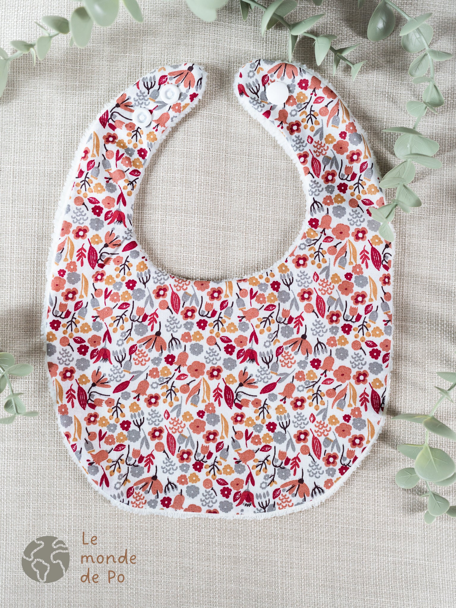 Ce bavoir convient dès la naissance jusqu'à l'âge de 2 ans. Il est composé d'une face en coton imprimé avec motifs fleurs roses et d'une face en éponge bambou couleur écru. Le bavoir se ferme à l'aide de boutons pression en plastique. Deux fermetures sont présentes à des distances distinctes afin de permettre une adaptation de la taille du bavoir en fonction de l'âge de l'enfant.