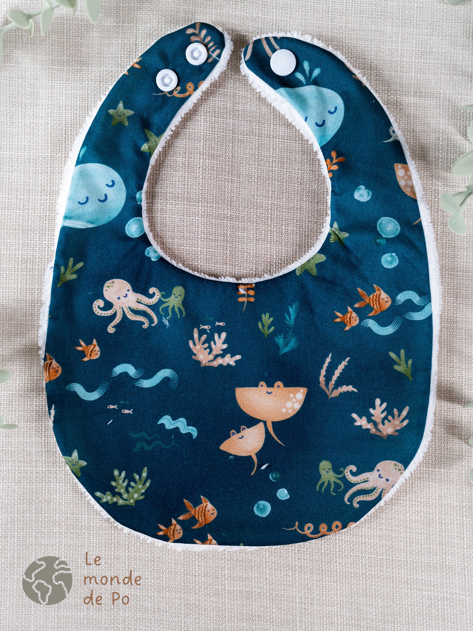 Ce bavoir convient dès la naissance jusqu'à l'âge de 2 ans. Il est composé d'une face en coton imprimé bleu marine avec motifs marins et d'une face en éponge bambou couleur écru. Le bavoir se ferme à l'aide de boutons pression en plastique. Deux fermetures sont présentes à des distances distinctes afin de permettre une adaptation de la taille du bavoir en fonction de l'âge de l'enfant.