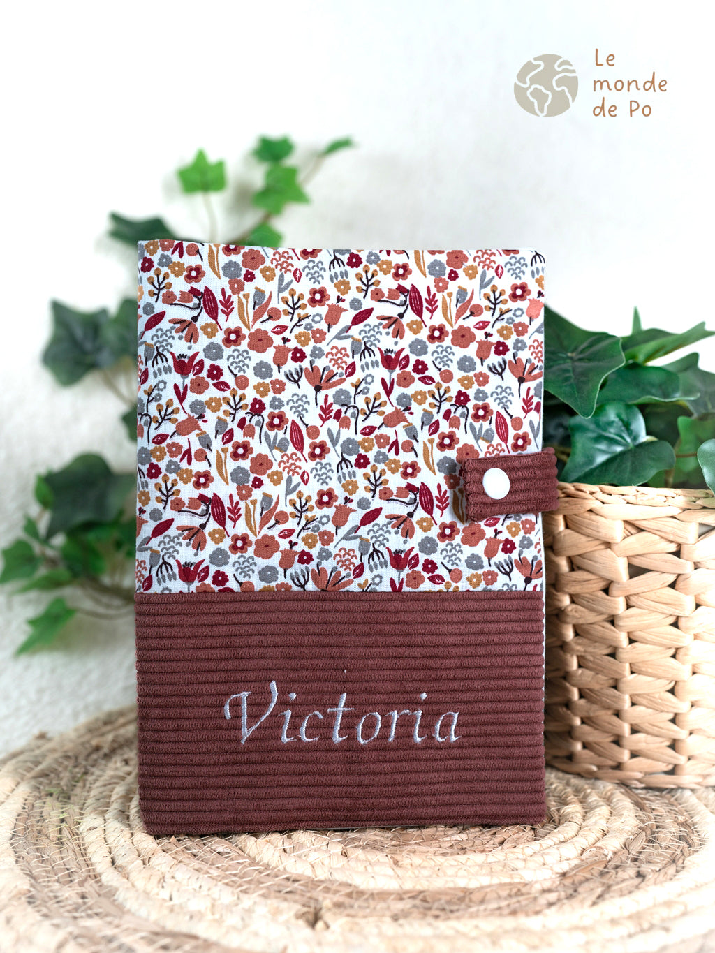 Housse en coton et velours côtelé. Avec 2 rabats pour glisser les pages de couverture du carnet de santé. Coton fleuri et velours côtelé rose. Intérieur couleur écru.