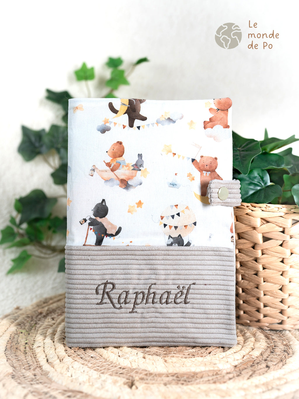 Housse en coton et velours côtelé. Avec 2 rabats pour glisser les pages de couverture du carnet de santé. Coton blanc motif le rêve des animaux et velours côtelé ubeige. Intérieur couleur écru.